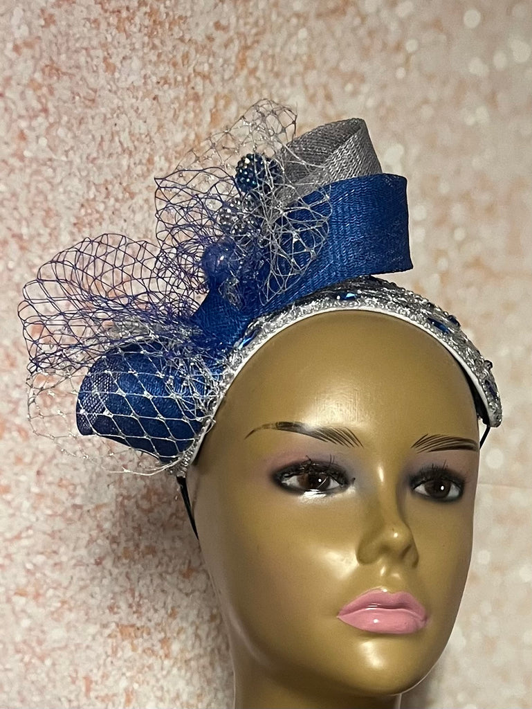 Silver and Blue Rhinestones Studded Headband Fascinator Half Hat for Church, Tea Party, Weddings and special occasions