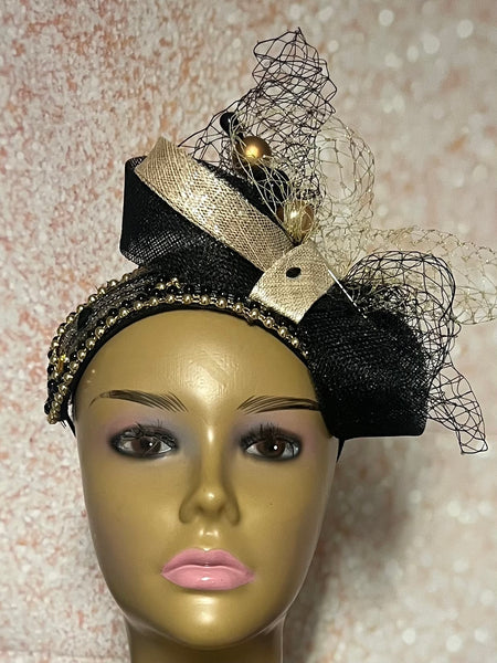 Black and Gold Beaded Sequin Headband-shaped Half Hat Fascinator for weddings, church and special occasions, Gift for Mom, Sister, Wife, Her