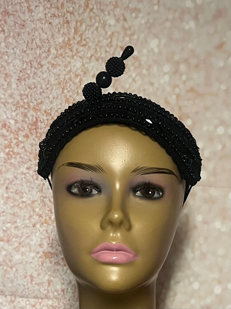 Simple, yet elegant. Headband-shaped Black Beaded Lace Fascinator, half hat trimmed with black gemstones and a hat pin.