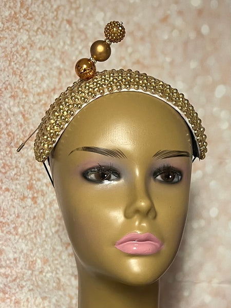 Looking for a head-turner? Look no further. This gold beaded piece fits the criteria. Gold beaded rhinestones hat accented with a hat pin. Perfect for church and any other special occasions: tea parties, weddings, etc.
