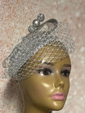 Looking for a head-turner? Look no further. This silver rhinestone-studded piece fits the criteria. The silver beaded hat is accented with rhinestones, then trimmed with Russian veil/netting, and a hat pin. Perfect for church and any other special occasions: tea parties, weddings, etc.