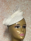 White Beaded Pearl Button Bow Half Hat Fascinator for weddings, church