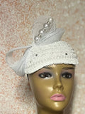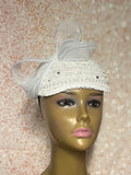 White Embroidered Lace Half Hat Fascinator for weddings, church, tea p