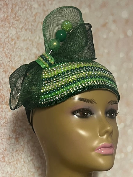 Green Beaded Fascinator Half Hat: Church, Tea Party, Wedding