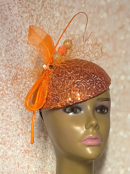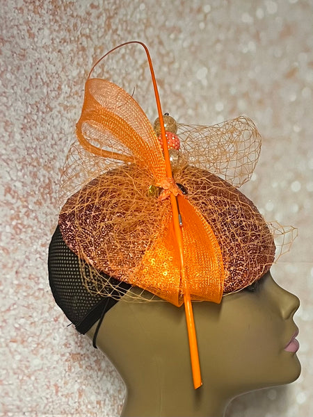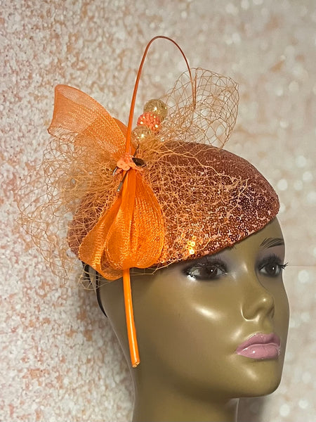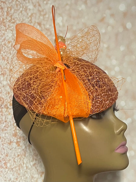 Orange Sequin Half Hat Fascinator for Church Head Covering, Wedding, Tea Party, Mother of the Bride, and Other Special Occasions