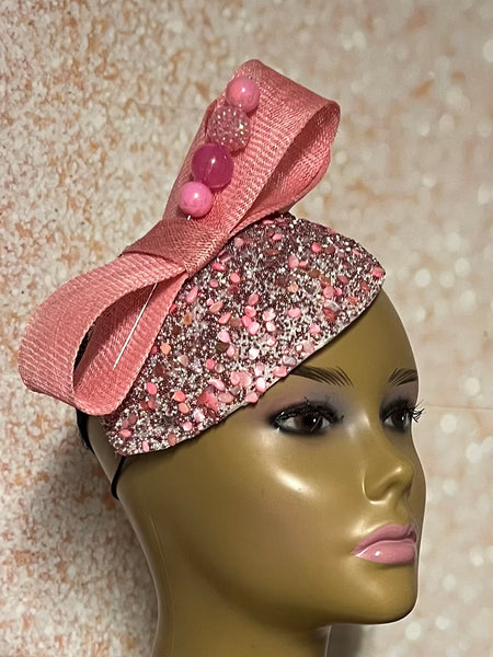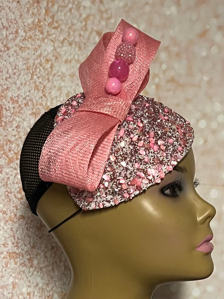 Pink Crystal Rhinestone Beaded Fascinator Half Hat with Bow for Church, Tea Parties Weddings and other special occasions