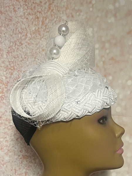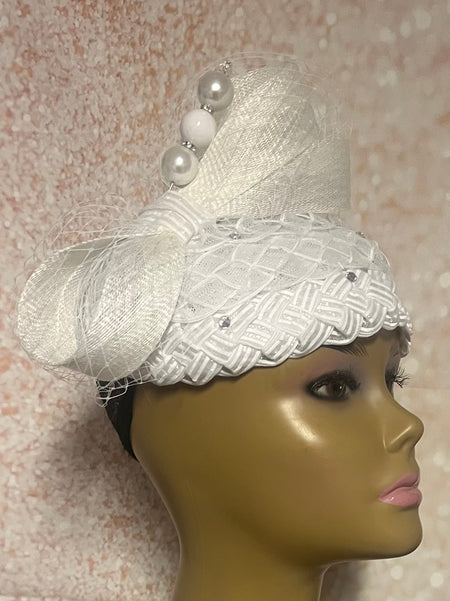 White Braided Sinamay Bow Fascinator Half Hat for Church Head Covering, Tea Parties and Other Special Occasions